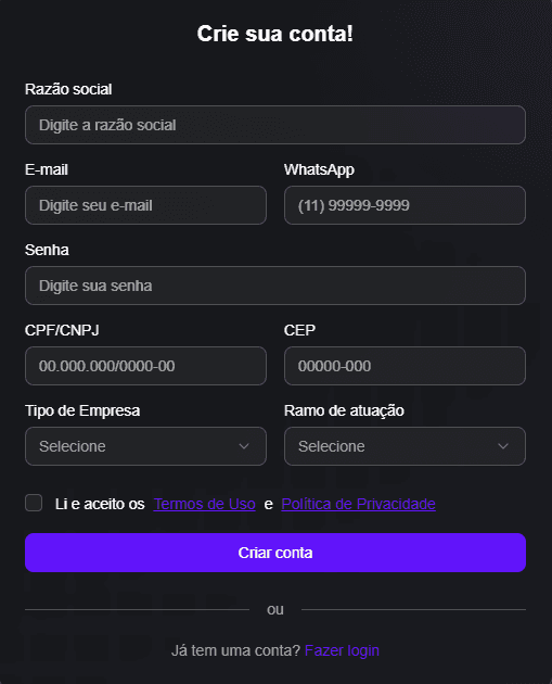 Crie sua conta em minutos e comece a receber seus valores instantaneamente